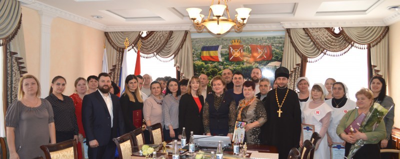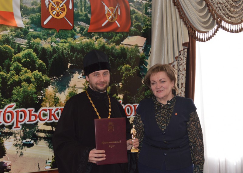 Глава Администрации района Овчиева Л.В, выразила слова благодарности благочинному приходов Нижнедонского округа протоиерею Сергию Яценко за реализацию социально-значимого для района проекта «Вера. Надежда. Любовь» и вручила Приветственный Адрес от районной Администрации.