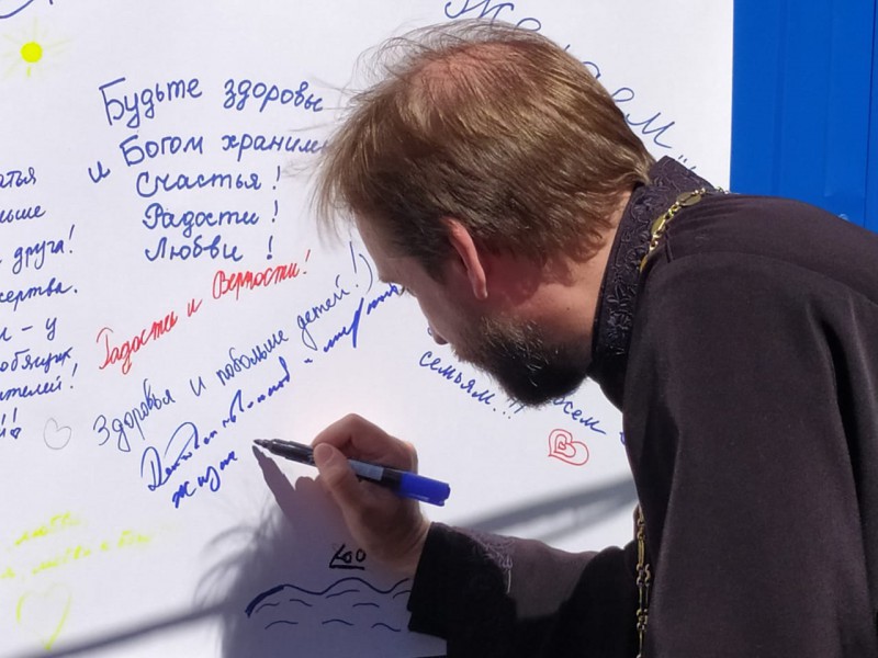 Настоятель храма протоиерей Сергий Яценко поздравил молодые семьи и тех кто прожил в браке многие годы с праздником, каждый желающий смог выбрать из "мешочка добрых пожеланий" высказывания святых о семье и браке. На заранее приготовленном ватмане молодые прихожане оставили свои пожелания всем участникам встречи.