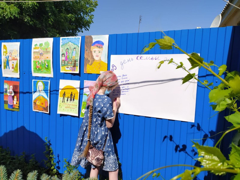 - Выставка детских рисунков "День Семьи, Любви и Верности", украшенная символом праздника, белыми ромашками.