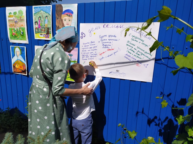 - Выставка детских рисунков "День Семьи, Любви и Верности", украшенная символом праздника, белыми ромашками.
