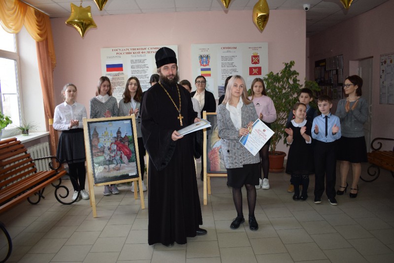 Благочинный приходов Нижнедонского округа протоирей Сергий Яценко и руководитель молодежного семейного клуба «Верность» храма Архистратига Михаила п. Каменоломни Марина Ершова вручили педагогам и школьникам Дипломы победителей и призеров конкурса и подарили на память иконы святого благоверного князя Александра Невского.