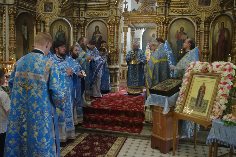 По завершении богослужения духовенство и прихожане поклонились перед святынями – иконой с частицей мощей святого благоверного князя Александра Невского, иконой с частицей мощей святого равноапостольного князя Владимира и мощевиком с частицей мощей святой блаженной Матроны Московской, которые 16 июля прибыли в храм для крестного хода, посвященного 10-летию создания Шахтинской епархии.