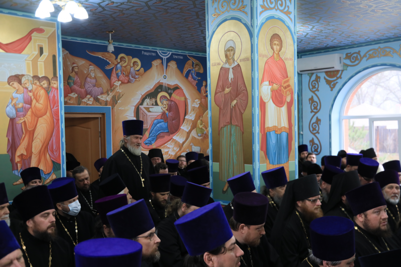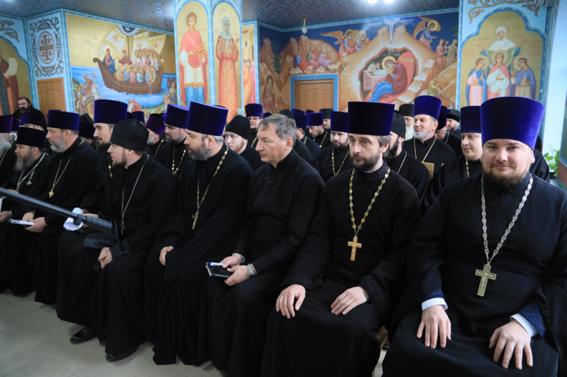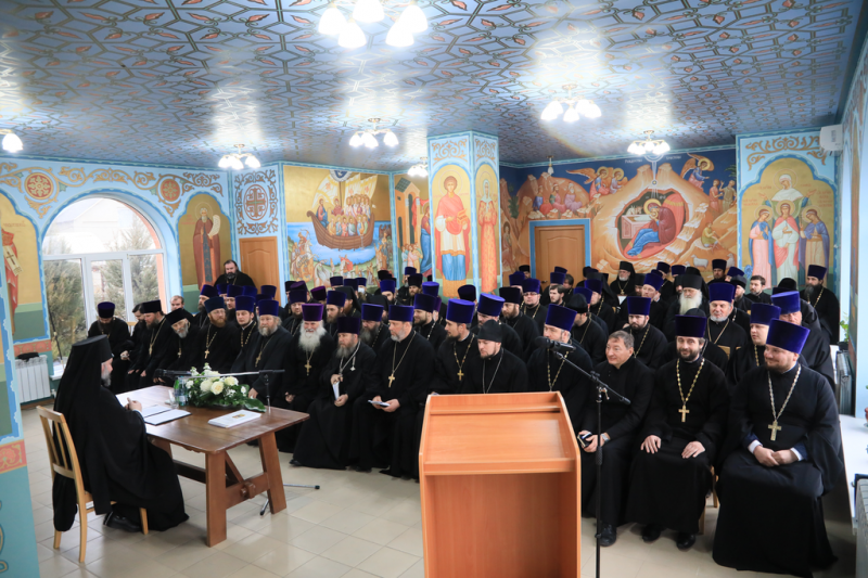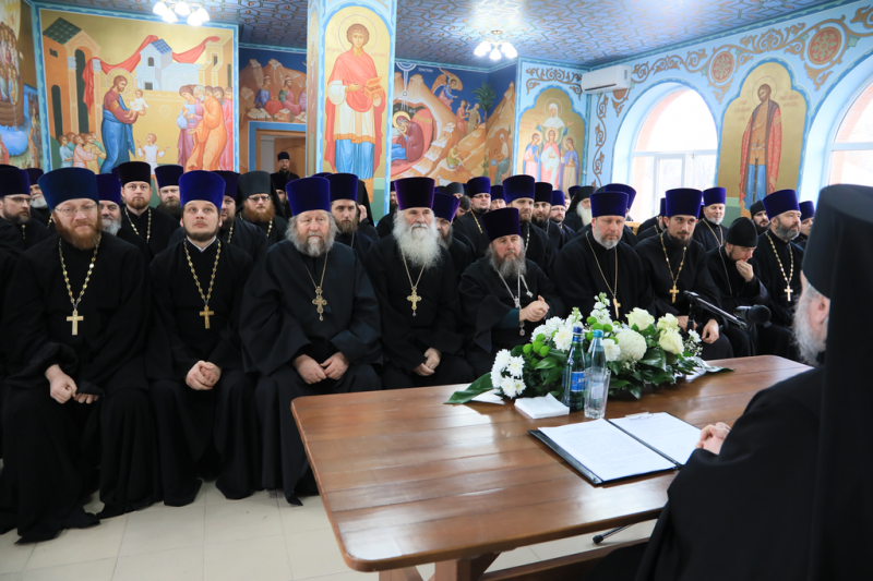 Архипастырь приветствовал священнослужителей и в своем докладе, подводя итоги уходящего года, привел статистические данные и отметил наиболее важные события епархиальной жизни.