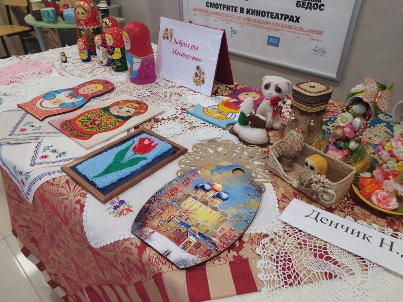 По благословению благочинного приходов Нижнедонского округа протоиерея Сергия Яценко, на выставке мастеров народного творчества, были представлены работы сестёр милосердия Марфо - Мариинского Сестричества храма Архистратига Михаила п. Каменоломни.