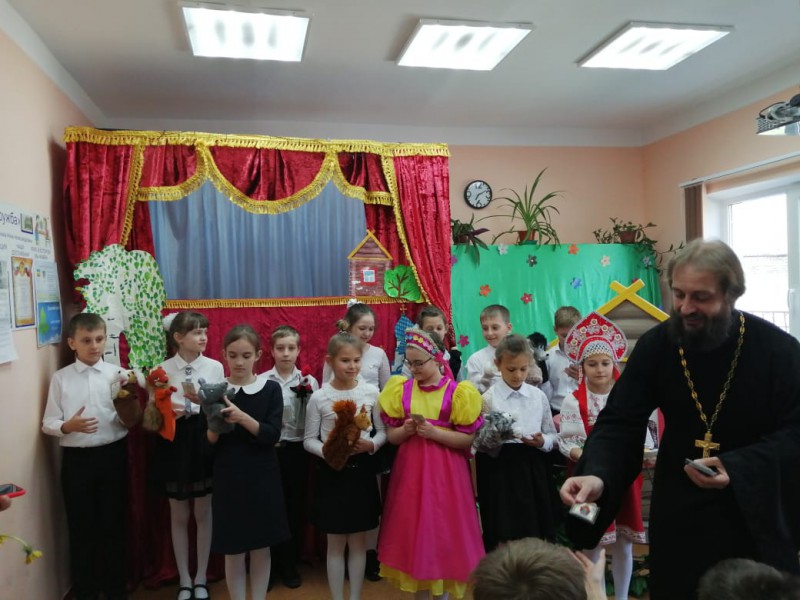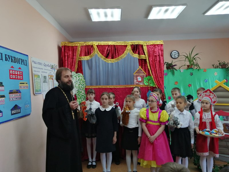 На Светлой Седмице, благочинный приходов Нижнедонского округа протоиерей Сергий Яценко посетил школу № 23 п. Красногорняцкий Октябрьского района и поздравил учащихся с великим праздником Пасхи.