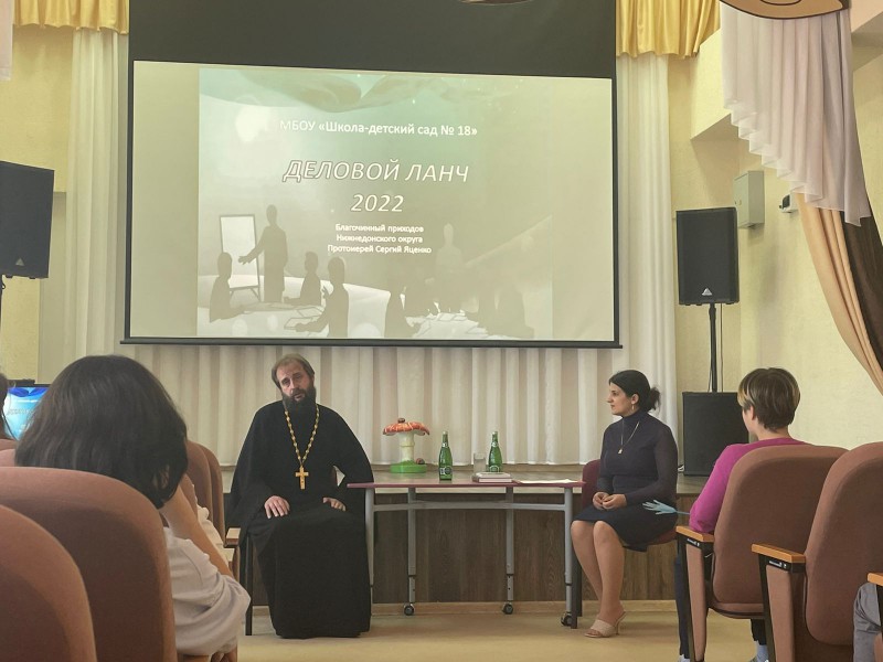 В рамках мероприятий «Деловой ланч. Диалог на равных» в МБОУ "Школа - детский сад №18" хутора Яново-Грушевский Октябрьского района, прошла встреча учащихся школы с председателем епархиального Отдела религиозного образования, благочинным приходов Александровск - Грушевского и Нижнедонского округов протоиереем Сергием Яценко.