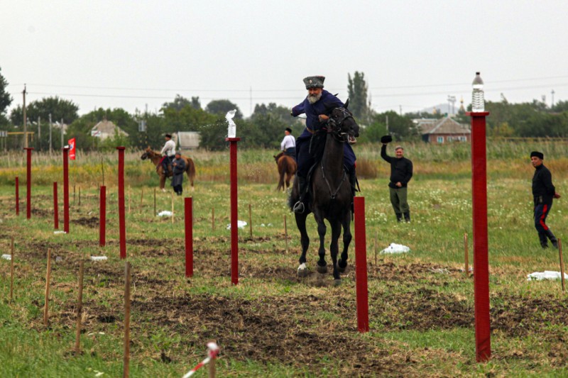 Участники продемонстрировали мастерство владения казачьей шашкой в пешем и конном порядке во время рубки разных мишеней.